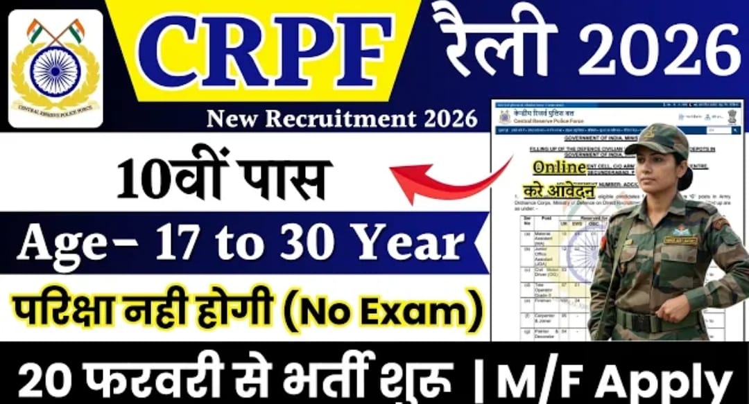 “CRPF भर्ती रैली 2026 की घोषणा! अगर आप 10वीं पास हैं और आपकी उम्र 17 से 30 वर्ष के बीच है, तो बिना लिखित परीक्षा के CRPF में शामिल होने का यह सुनहरा मौका है। 20 फरवरी से शुरू होने…