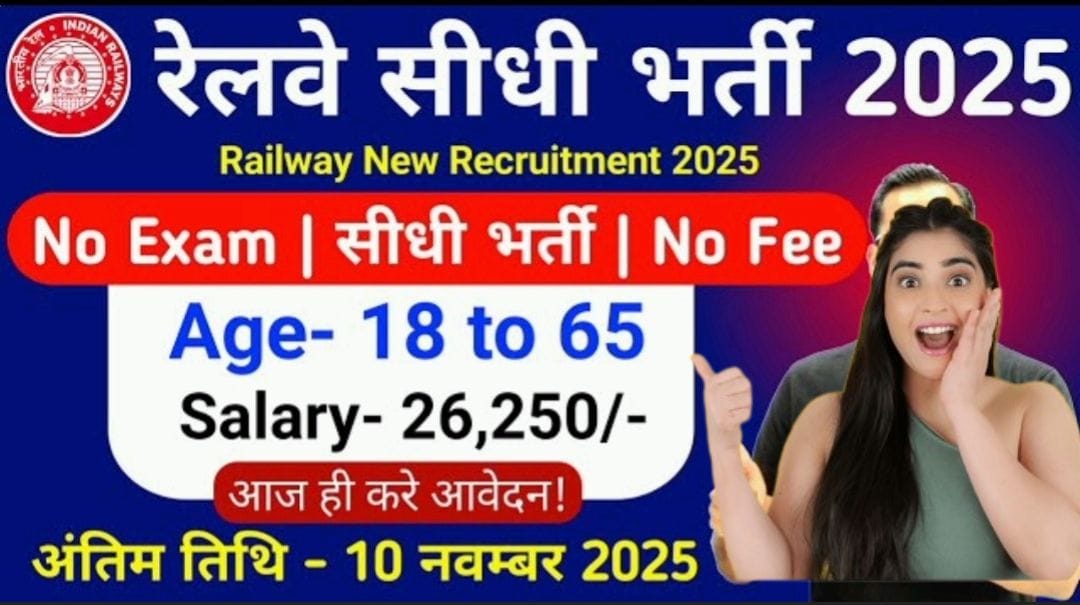 रेलवे सीधी भर्ती 2025 में बिना परीक्षा और बिना फीस आवेदन शुरू, ₹26,250 वेतन के साथ 18 से 65 वर्ष तक उम्मीदवार कर सकते हैं आवेदन।